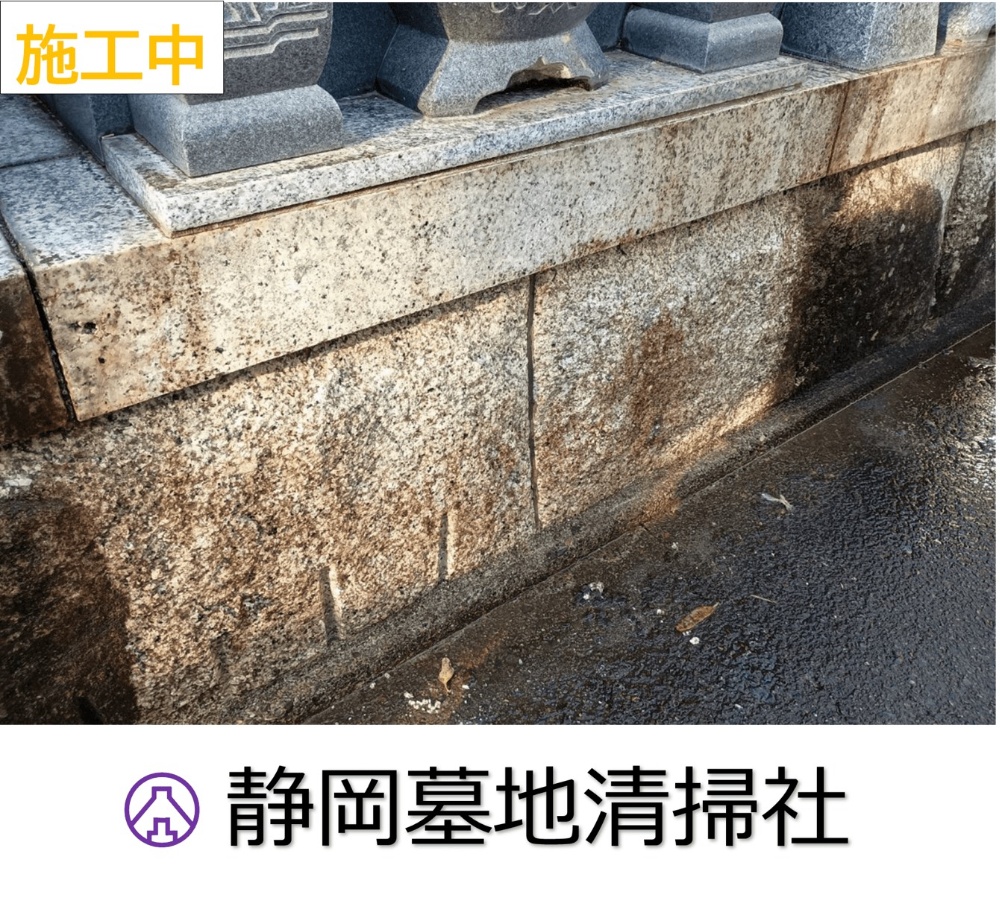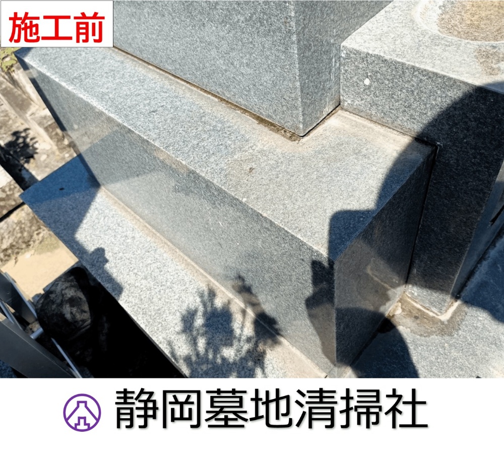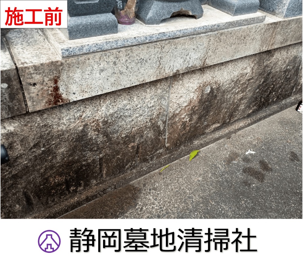 苔カビ藻などが付着し真っ黒に変色した墓石の土台部分