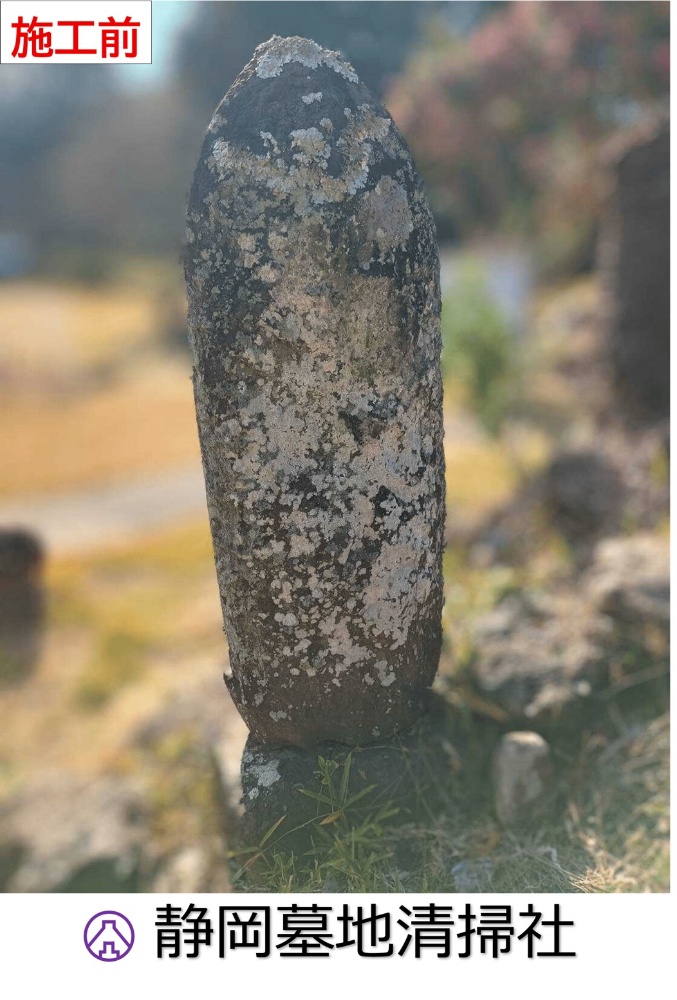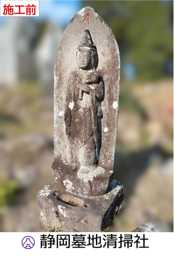 お寺様より約300年くらい前の石仏の清掃。蓄積された汚れと苔カビ藻などが付着した状態で文字が読みづらい状態です。慎重な作業が求められます。
